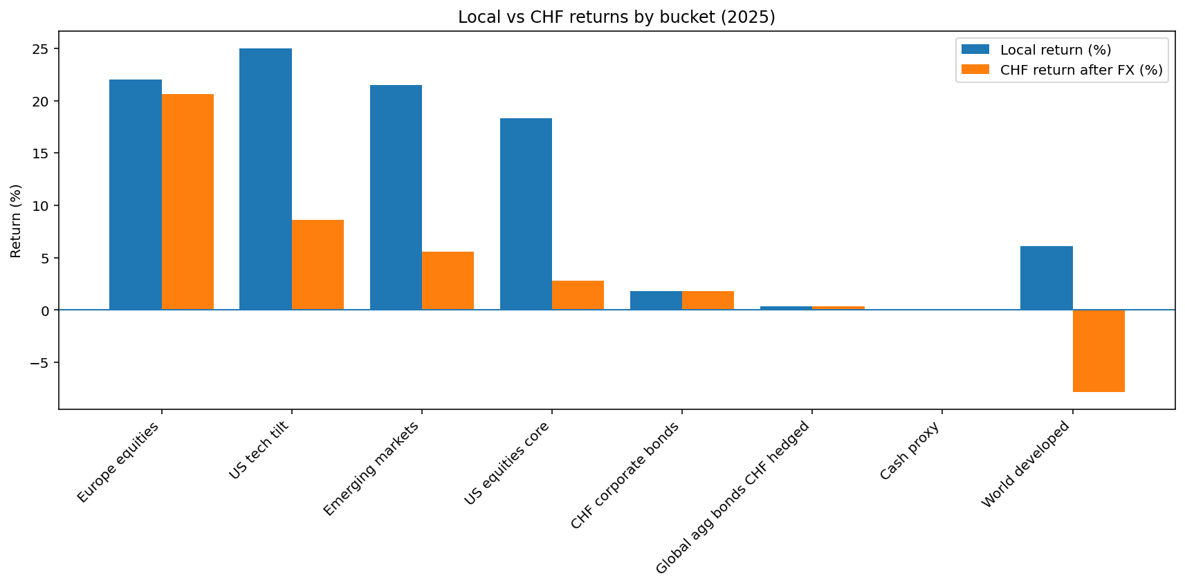 The 2025 picture illustrates why this matters. Some sleeves look similar in local and CHF terms: Europe equities stayed broadly intact, and CHF corporate bonds are effectively unchanged because the exposure is already in CHF (low single digits in both). By contrast, USD-heavy equity sleeves show that FX can dominate the CHF outcome: a US tech tilt that was very strong in local terms ends up much more muted in CHF (single digits), and even US core equities compress from a high-teens local return to only a low single-digit CHF result. The most striking example is World developed: positive in local terms but negative once expressed in CHF, highlighting how translation can flip the sign of performance in a CHF-based mandate.